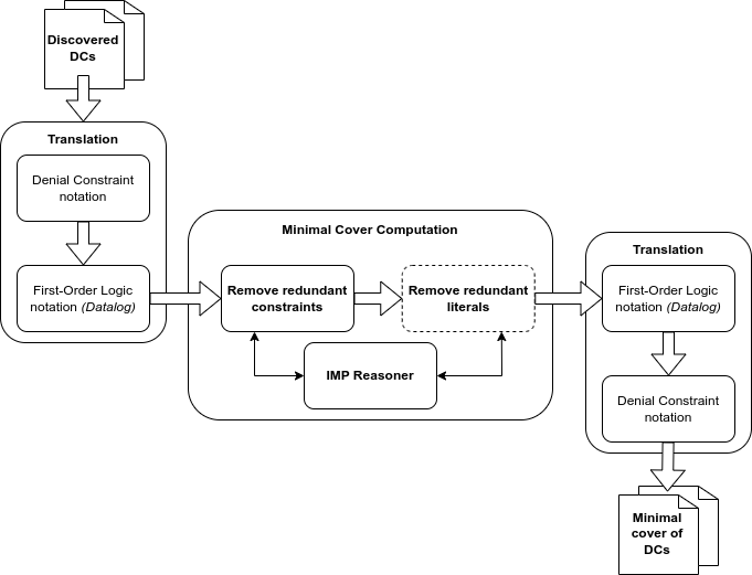 La imatge de sota mostra un diagrama simplificat del nostre sistema: agafa com a input les DCs descobertes pels algorismes existents, les tradueix a Datalog, les minimitza mitjançant el l’IMP Reasoner i les torna a traduir a notació DC, donant com a resultat el conjunt mínim de les restriccions originals.